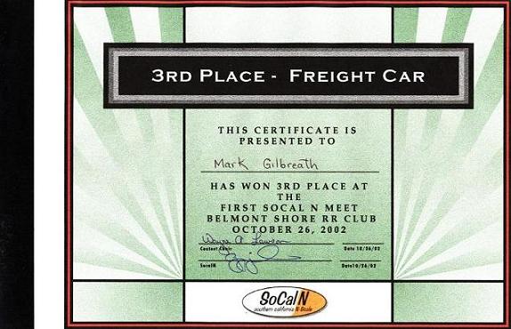 Member's Awards Here is Jim Bence's Krauss Maffei that took First in the Diesel Engine Category. Here is Mark Gilbreath's Santa Fe Caboose that took Third in the Freight Category. Click here to see more equipment by them and other members