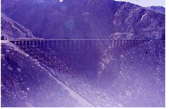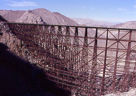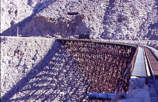 The railroad struggled on in it's early days facing avalanches blocking Tunnel 7 on May 10th, 1920, border closings with Mexico in 1929 and a tunnel fire at Tunnel 3 in Mexico in January 1932. Damage for rainstorms came in 1926, 1927 and 1929. On March 27,1929 a slide blocked Tunnel 15. The company had enough of problems with Tunnel 15, eliminated part of it and built the 636 foot, 185 foot high wood-pile Goat Creek Trestle. The trestle was made out of wood because steel would have expanded and contracts in the extreme temperatures of the Carriso Gorge from below freezing in the winter to the over 110+ degrees temperatures in the summer. Months later on October 22, 1929 Tunnel 7 burned and this time was bypassed by a seven degree curves. On October 24,1932 the Southern Pacific Railroad gained control of the railroad changing it's name to the San Diego & Arizona Eastern. The last passenger train run took place on January 11,1951. The SP ran the line with little problems until 1951 when washouts and a floods near Tunnel 8 and 10 shut down the line once more until repairs could be made. Things returned back to normal with no more major operating problems until September 10,1976 when the final major disaster hit the San Diego & Arizona Eastern Railroad, Tropical Storm Kathleen, wiped out the linein the desert. Three trestles were completely destroyed and five others damaged as well as 50 washouts and slides. The SP announced that it would cost $1.27 million dollars to repair the line.