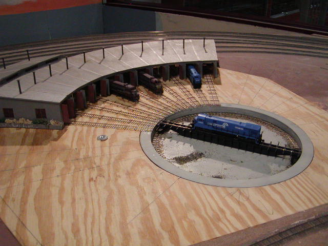 Here is a shot of the newly installed crossover. Allowing traffic to go from the west yard to the east yard and out onto the main line. This could not be accomplished with out backing down the ladder to tracks allowing traffic to the main. This cross-over was built by Mark Gilbreath the Roadmaster. Closer picture showing the detail and the work going into this switch. A different angle. ie birds eye view. Closer picture showing the detail and the work going into this switch. Closer picture showing the detail and the work going into this switch. Here is Hans and Gilbert getting a good plan of action before the first cut is made! This is Hans and Brian making sure the board is just right before cutting the piece to fit for the new turn table. Here is the final cut for the new turntable. Here is the new turntable for National City, the pit is done. And the bridge is 50% till after the track is laid to the pit. Don't want to break off the detail parts on the bridge. This turntable is 135 feet, manufactured by Custom Model Railroads. Its a very good kit. The instructions are easy to understand. We substitute code 40 rail for what came with it. So the bridge had to be shimmed up to match. It only took us five years to get to this point. It was well worth the wait, I think. Well, we got the tracks leading to the Roundhouse. The pit has been installed. Really starting to look good, can't believe its taken 8 years and two turntable to get this far. Ah, such is the life in a club! Next page (2)