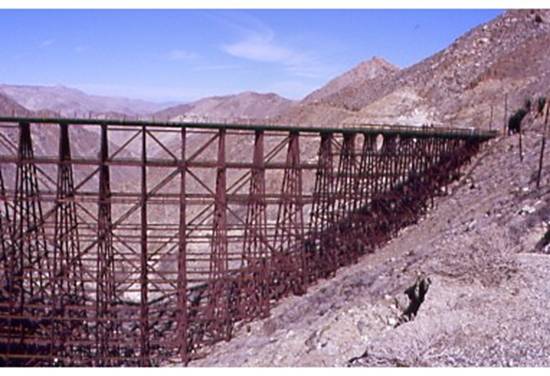 The railroad struggled on in it's early days facing avalanches blocking Tunnel 7 on May 10th, 1920, border closings with Mexico in 1929 and a tunnel fire at Tunnel 3 in Mexico in January 1932. Damage for rainstorms came in 1926, 1927 and 1929. On March 27,1929 a slide blocked Tunnel 15. The company had enough of problems with Tunnel 15, eliminated part of it and built the 636 foot, 185 foot high wood-pile Goat Creek Trestle. The trestle was made out of wood because steel would have expanded and contracts in the extreme temperatures of the Carriso Gorge from below freezing in the winter to the over 110+ degrees temperatures in the summer. Months later on October 22, 1929 Tunnel 7 burned and this time was bypassed by a seven degree curves. On October 24,1932 the Southern Pacific Railroad gained control of the railroad changing it's name to the San Diego & Arizona Eastern. The last passenger train run took place on January 11,1951. The SP ran the line with little problems until 1951 when washouts and a floods near Tunnel 8 and 10 shut down the line once more until repairs could be made. Things returned back to normal with no more major operating problems until September 10,1976 when the final major disaster hit the San Diego & Arizona Eastern Railroad, Tropical Storm Kathleen, wiped out the linein the desert. Three trestles were completely destroyed and five others damaged as well as 50 washouts and slides. The SP announced that it would cost $1.27 million dollars to repair the line.