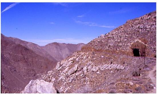 What a much better view I now had as the train started moving again. It was now easier to look up, across and down into the Carrizo Gorge. We passed the location of Tunnel 7 which collapsed on October 22,1932 as the train went around the rocky point high above the Carrizo Gorge. Down below there is the remains of the Coors Box Car that we over the edge in 1953. There is also a remains of a construction camp located far below the tracks on one of the few level area in the gorge. That led us up to the 2527 foot long Tunnel 8. This is one tunnel that they reopened with the south entrance using gunite, a concrete mixture under pressure over steel reinforcements, that has stabilized the tunnel. Talk about one long tunnel and it's a dusty world inside the tunnel's darkness. Of course the engine's headlights and ditch light shows the way to the northern exit. To the right of the northern entrance of tunnel 8 up above the tracks there is a spring. We crossed the 15 foot trestle as we made our way to Tunnels 9 and 10 which are inline. Tunnel 9 is 600 feet long while Tunnel 10 is 925 feet long. Our train snaked it way to Tunnel 11 which is 381 feet long. Beyond this tunnel is the Carriso Gorge siding which is only 863 feet long but in the only place in the gorge so far that a siding could be built.