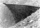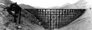 The current prototype trestle was built in 1932 when an adjacent tunnel collapsed and the entrance slid 30 feet down the side of the mountain. The need to keep trains running required a quick solution until the tunnel was rebuilt. The answer was this large wood trestle. It worked so well that the tunnel was never rebuilt. The trestle is still standing, and will be used again once the collapsed tunnels on other parts of the line are repaired. Here are some of my photos of the actual trestle: